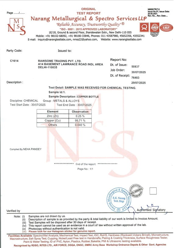 - CZYSTA MIEDŹ (99,7% Cu i 0,3% Zn - taki dodatek cynku konieczny jest aby zapewnić trwałość i funkcjonalność miedzianych naczyń)