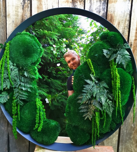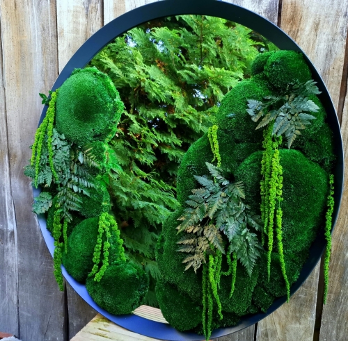 Pokaźne lustro o średnicy 80cm ze stabilizowanym mchem bielistką, paprocią i amarantusem.