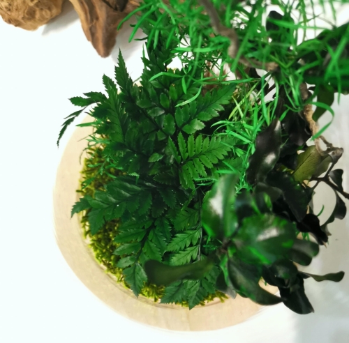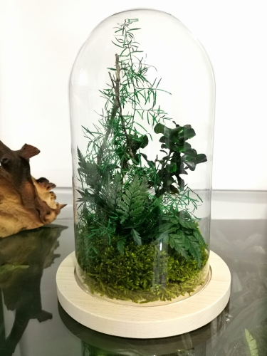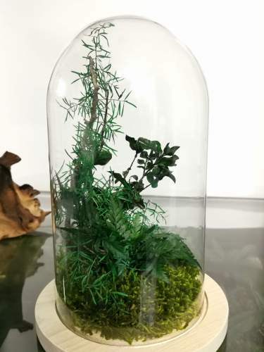 Nasze szkło jest łatwiejsze w utrzymaniu w czystości niż standardowy słoik i nie paruje. Kompozycje wykonujemy z naturalnych roślin stabilizowanych (mech, paproć, asparagus i inne) oraz korzeni. Las wykonany jest na spodzie drewna. Taka kompozycja to około 10 lat naturalnego piękna. Nie wymaga pielęgnacji aby cieszyć swoim wyglądem. Kompozycje tworzymy samodzielnie z wysokiej jakości roślin.